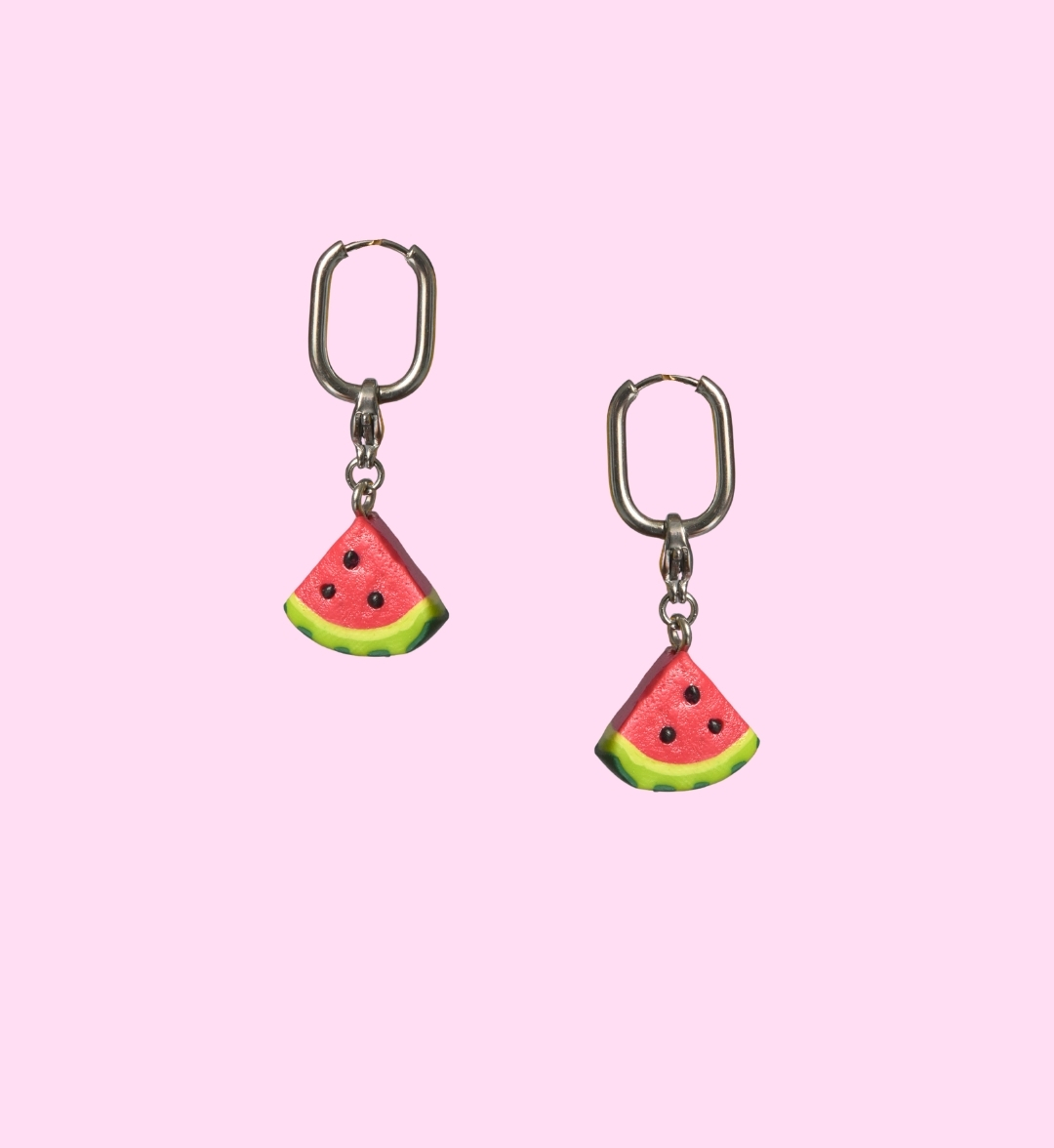 ¡Pequeñas dosis de felicidad! 🥑🍓🎀 Las Candongas Mini 1charm son el accesorio diario ideal. Unos modernos aros rectangulares en acero inoxidable plateado o con un baño de oro, combinados con un charm modelado 100% a mano en arcilla polimérica. Disponibles en: Aguacate, Fresa, Sandía, Moño o Pastel. ¡Colecciónalos todos!
